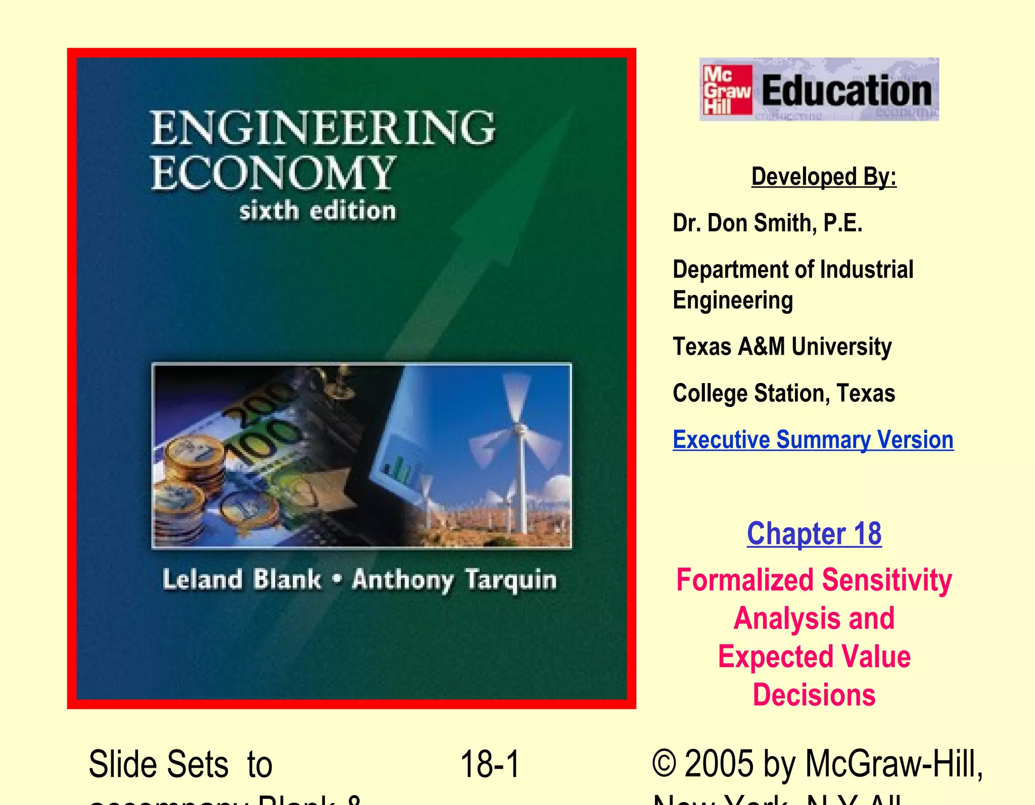This document provides an overview of techniques for formalized sensitivity analysis and expected value decisions. It discusses determining sensitivity to parameter variation, using three estimates to analyze sensitivity, calculating expected values of cash flows and alternatives, and using decision trees to model staged evaluations under uncertainty. The techniques aim to account for variability in parameters, quantify uncertainty through probabilities, and identify best decisions considering risk.
