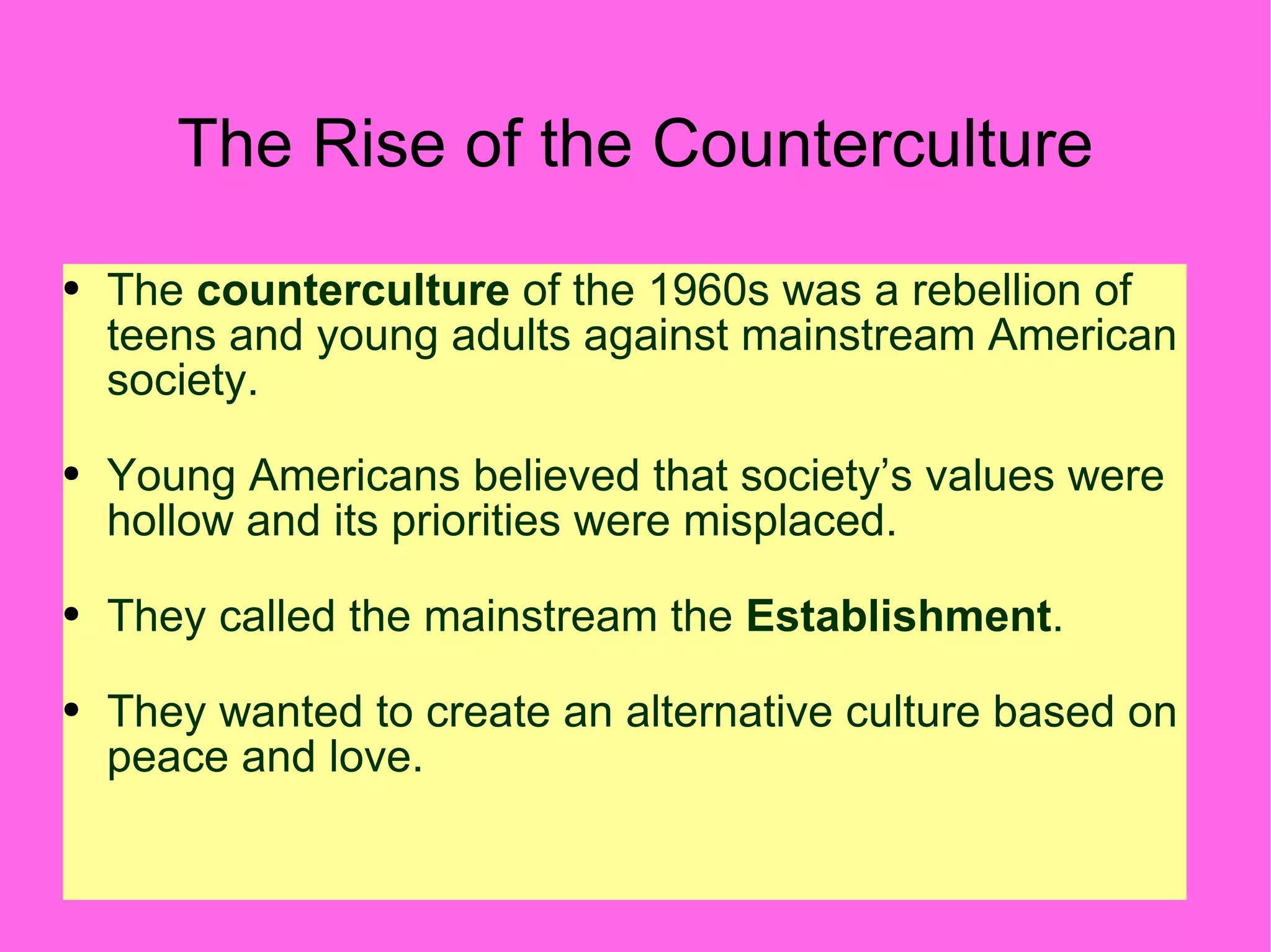 The counterculture movement of the 1960s originated from young Americans rebelling against mainstream values and priorities. They believed society's values were hollow and its focus was misplaced. Inspired by the Beat generation of the 1950s, the counterculture movement grew out of opposition to the Vietnam War, racial discrimination, and environmental pollution. They advocated for a culture based on peace and love as an alternative to the mainstream.