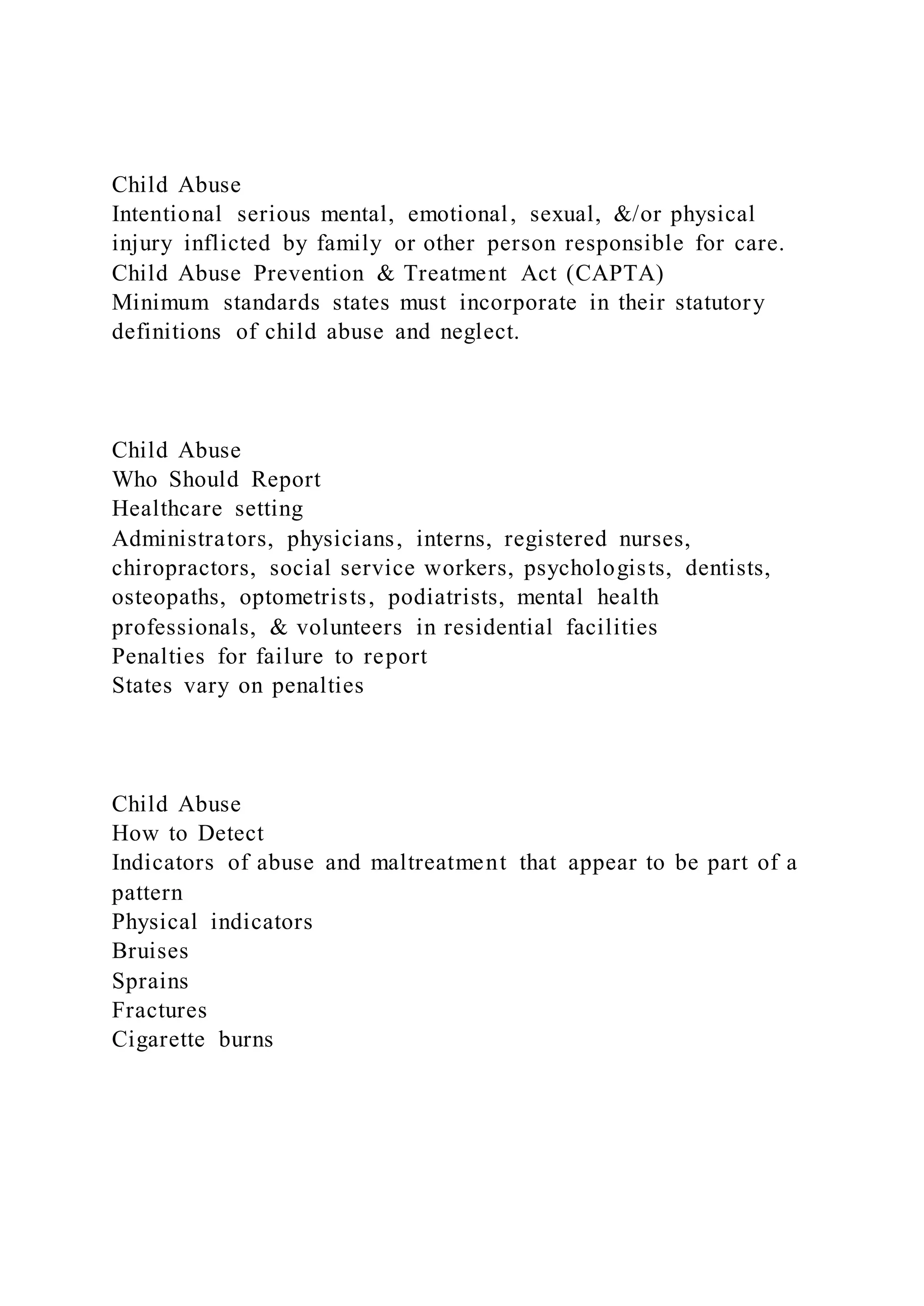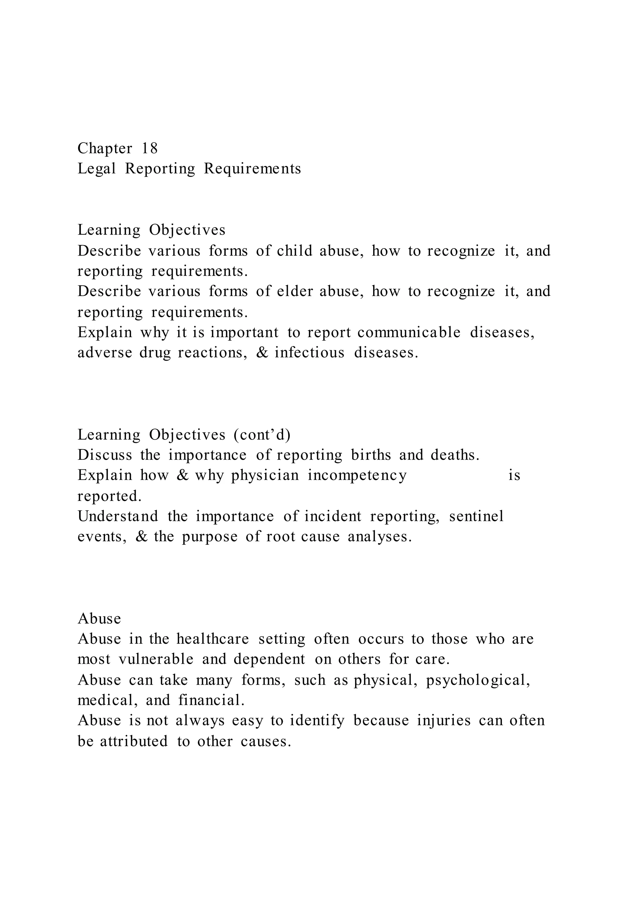 The document outlines the legal reporting requirements related to child and elder abuse, including identification, documentation, and the necessity for healthcare professionals to report such incidents. It also emphasizes the importance of reporting communicable diseases, adverse drug reactions, and maintaining accurate medical records to protect patient rights and enhance care quality. Furthermore, it discusses the role of various regulations, such as HIPAA, in securing patient privacy and the challenges posed by both traditional and electronic medical records.