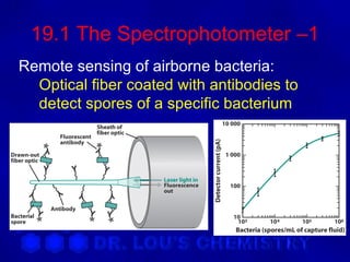 This document discusses spectrophotometry and luminescence techniques. It describes the basic components of a spectrophotometer including the light source, monochromator, and detector. The monochromator uses prisms or diffraction gratings to separate wavelengths and can be used to measure absorption across the spectrum. Luminescence techniques like fluorescence and phosphorescence can provide information about electronic transitions and are used in analytical applications like immunoassays and environmental analysis due to their high sensitivity.