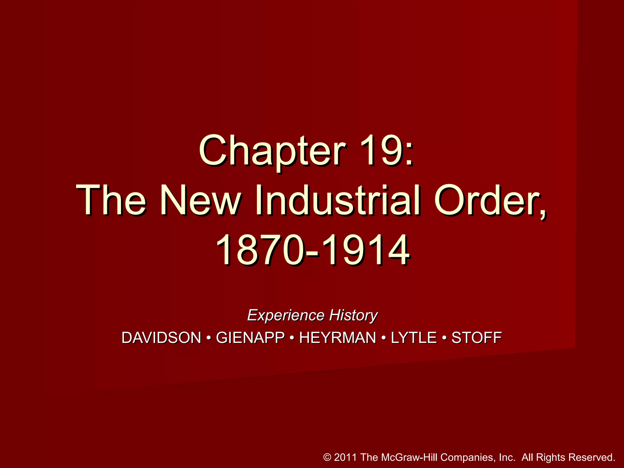 The document is a chapter from a history textbook about the emergence of industrial systems in the United States between 1870-1914. It summarizes key developments like the growth of large corporations in industries like steel, oil, and railroads. New technologies and business strategies led to consolidation and vertical integration. The chapter also examines the development of labor organizations amid changing work conditions for many Americans and periods of social unrest over labor issues.