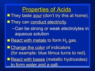 Acids have a pH below 7 and react with bases to form salts and water. Common acids include hydrochloric acid, sulfuric acid, and acetic acid. Bases have a pH above 7 and react with acids in neutralization reactions. Common bases are sodium hydroxide, calcium hydroxide, and potassium hydroxide. Indicators are used to test whether a solution is acidic or basic by changing color in different pH ranges.