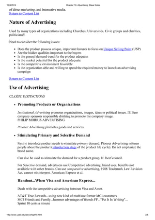 1) It defines advertising and discusses its advantages and disadvantages.