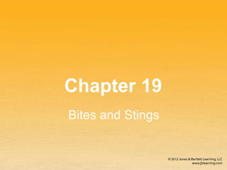 This document provides information on bites, stings, and injuries from various animals. It discusses animal bites, including from dogs, snakes, spiders, and insects. Specific types of bites covered include those from pit vipers, coral snakes, black widows, brown recluse spiders, scorpions, and centipedes. The document also discusses care for these various bites and stings, as well as recognizing symptoms of infections or allergic reactions. Marine animal injuries like shark bites are briefly mentioned at the end.
