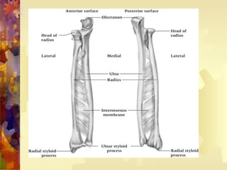 The document describes various aspects of elbow anatomy including bony structures like the medial and lateral epicondyles, ligaments, muscles, nerves, common injuries, and clinical tests. Key points are that the elbow is a hinge joint formed by the humeroulnar and radioulnar joints, the ulnar nerve can be impinged behind the humerus, and lateral epicondylitis is the most common overuse injury involving repetitive elbow extension motions.