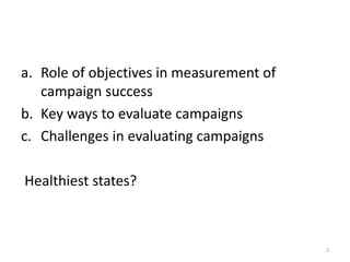 1) The role objectives play in measuring campaign success and key ways to evaluate campaigns. Challenges include measuring campaigns.