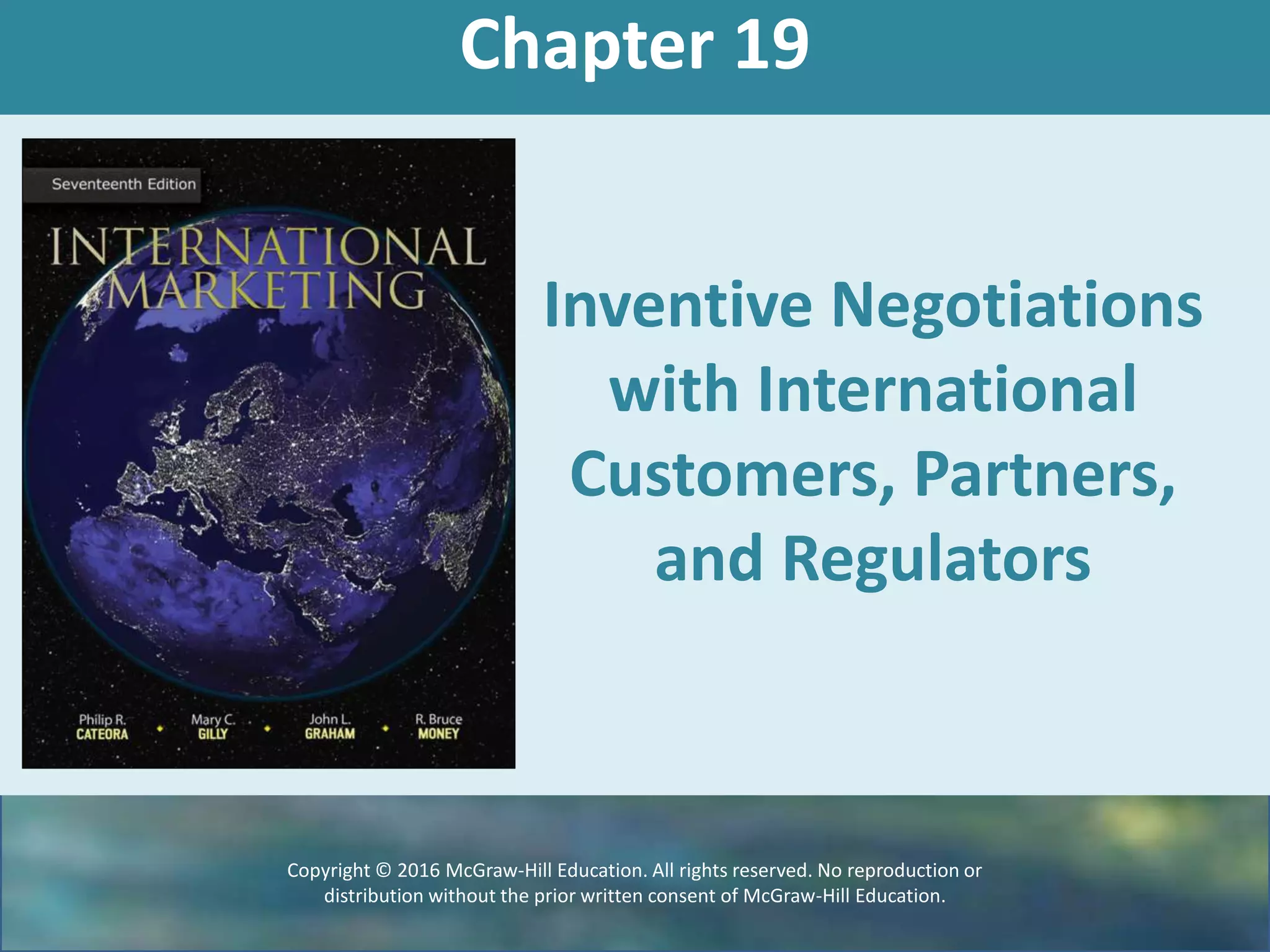This document discusses international business negotiations. It begins by outlining the learning objectives, which focus on understanding how culture influences negotiation behaviors and styles. It then provides examples of cultural stereotypes to avoid when negotiating internationally. Several exhibits analyze data on negotiation tactics and behaviors across different cultures. Key differences are identified in areas like language use, nonverbal behaviors, and preferred communication styles. The document emphasizes that successful international negotiations require understanding both cultural and individual factors, rather than relying on stereotypes. The goal is to negotiate effectively across borders.