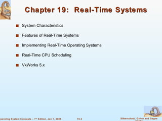 Chapter 19 discusses real-time systems, highlighting their timing requirements and distinguishing between hard and soft real-time systems. It covers the characteristics, implementation of real-time operating systems, and various CPU scheduling algorithms such as rate monotonic and earliest deadline first scheduling. Additionally, it describes the features of real-time kernels and details specific systems like VxWorks 5.0.