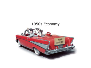 The post-WWII US economy experienced strong growth fueled by increased consumer demand, the GI Bill, and federal spending on defense and infrastructure. The GI Bill provided education and unemployment benefits for veterans, contributing to a boom in higher education and home construction. A postwar baby boom also increased the population. President Truman faced challenges like inflation, labor unrest, and civil rights issues. His Fair Deal proposals were mostly rejected. President Eisenhower continued economic growth through infrastructure spending while moderating political tensions. The 1950s saw rising prosperity across the US.