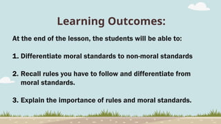 The document presents a lesson on ethics and morality, outlining learning outcomes for students to differentiate between moral and non-moral standards and the importance of these concepts. It defines ethics as a philosophical inquiry into questions of morality, while also exploring features of morality, societal rules, and the distinctions between moral and non-moral standards. Key points include the characteristics of moral standards and their significance in regulating behavior and promoting justice within society.
