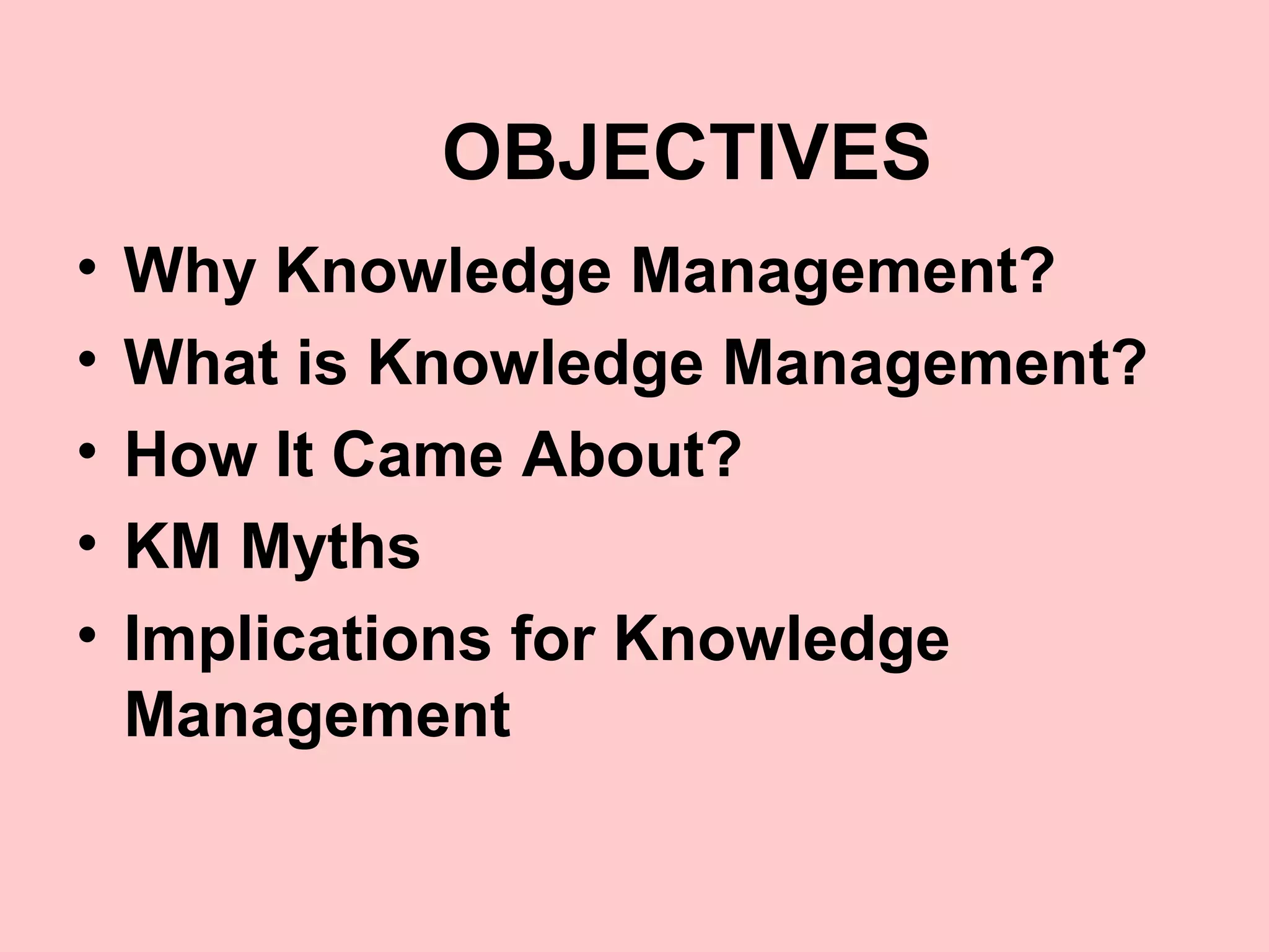 The document discusses the objectives, definitions, history, and key concepts of knowledge management (KM). It aims to explain why KM is important for businesses in today's economy that relies heavily on knowledge workers. KM is defined as the process of identifying, capturing, sharing, and evaluating an organization's information and expertise. It emerged due to factors like globalization, downsizing, and increased data sharing capabilities. The document outlines the KM lifecycle and various challenges organizations face in effectively managing their knowledge.