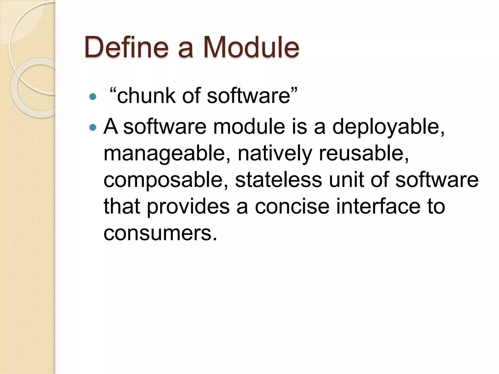 Chapter 1 defines a software module as a deployable, manageable, natively reusable, composable, and stateless unit with a concise interface. It discusses the characteristics of modules, including their independent testability and the ability to improve development efficiency. The chapter concludes by identifying the jar file as the best candidate for modularity on the Java platform.