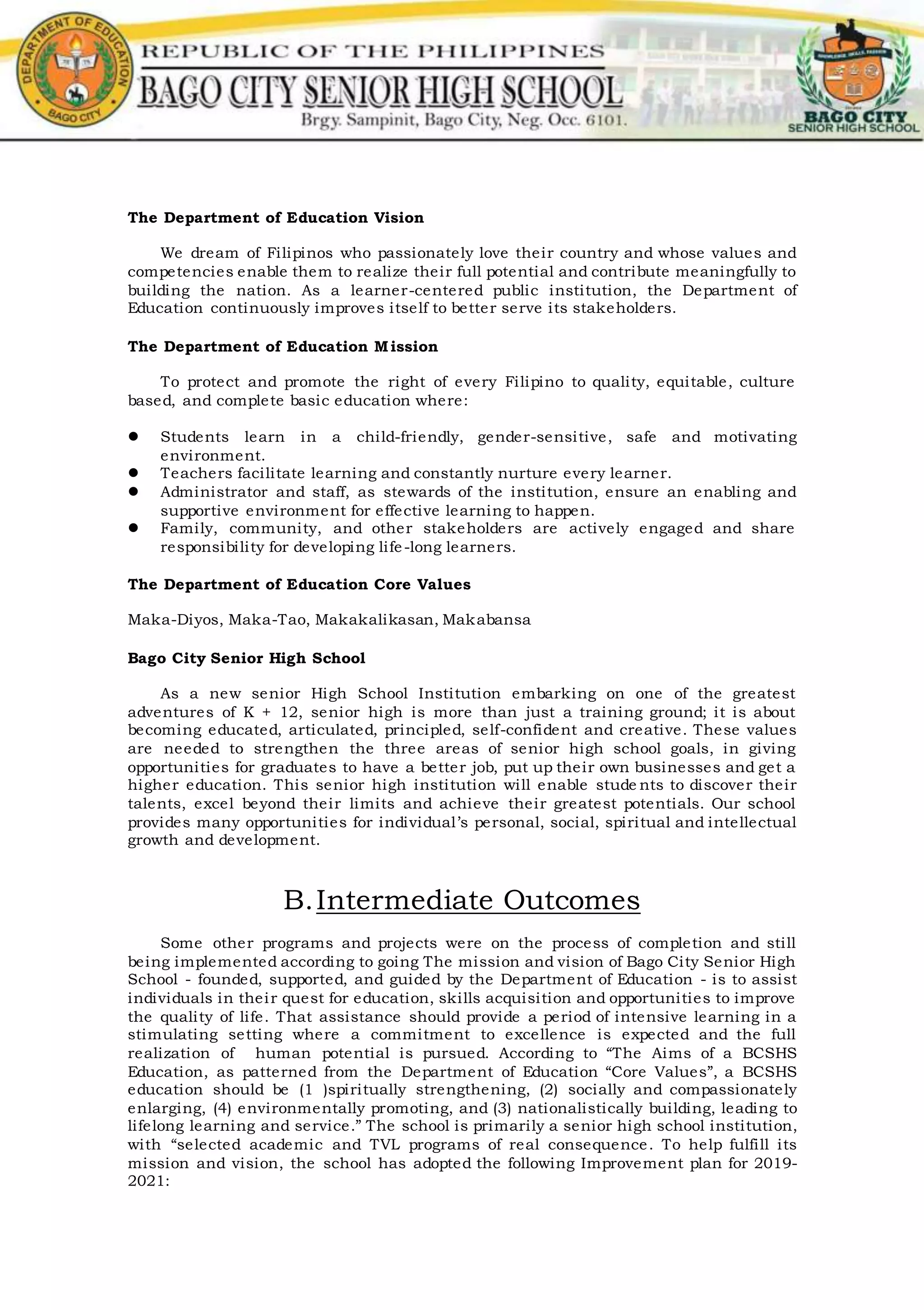 Bago City Senior High School's mission is to assist students through education, skills development, and opportunities to improve quality of life. Their 10-year improvement plan includes enhancing teaching and learning, library resources, appreciation of Filipino culture, student life, facilities, sustainability, alumni relationships, fundraising, and strategic planning.