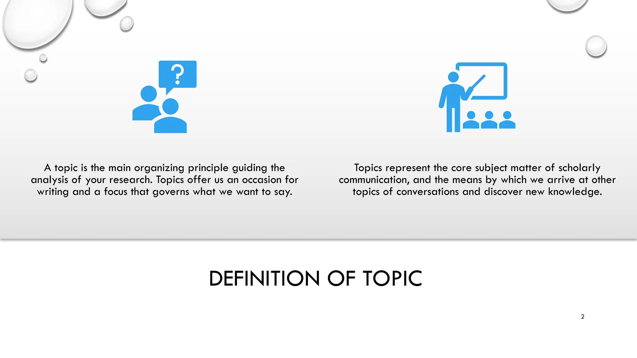 The document provides guidance on choosing and developing a research topic. It discusses beginning with a topic assigned by the professor, choosing from a list of topics, or selecting your own topic. Key steps include narrowing or broadening the topic to make it manageable, and extending the timeliness of very current topics. The document emphasizes identifying concepts, reviewing literature to refine the topic, and outlining the paper before an in-depth literature review.