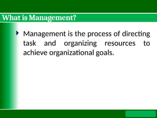 Management involves directing tasks and organizing resources to achieve goals, while information is meaningful data used in decision-making. An information system consists of interrelated components for collecting, processing, storing, and distributing information to support organizational decision-making. The document outlines the types, components, advantages, and disadvantages of information systems, including their role in management information systems.