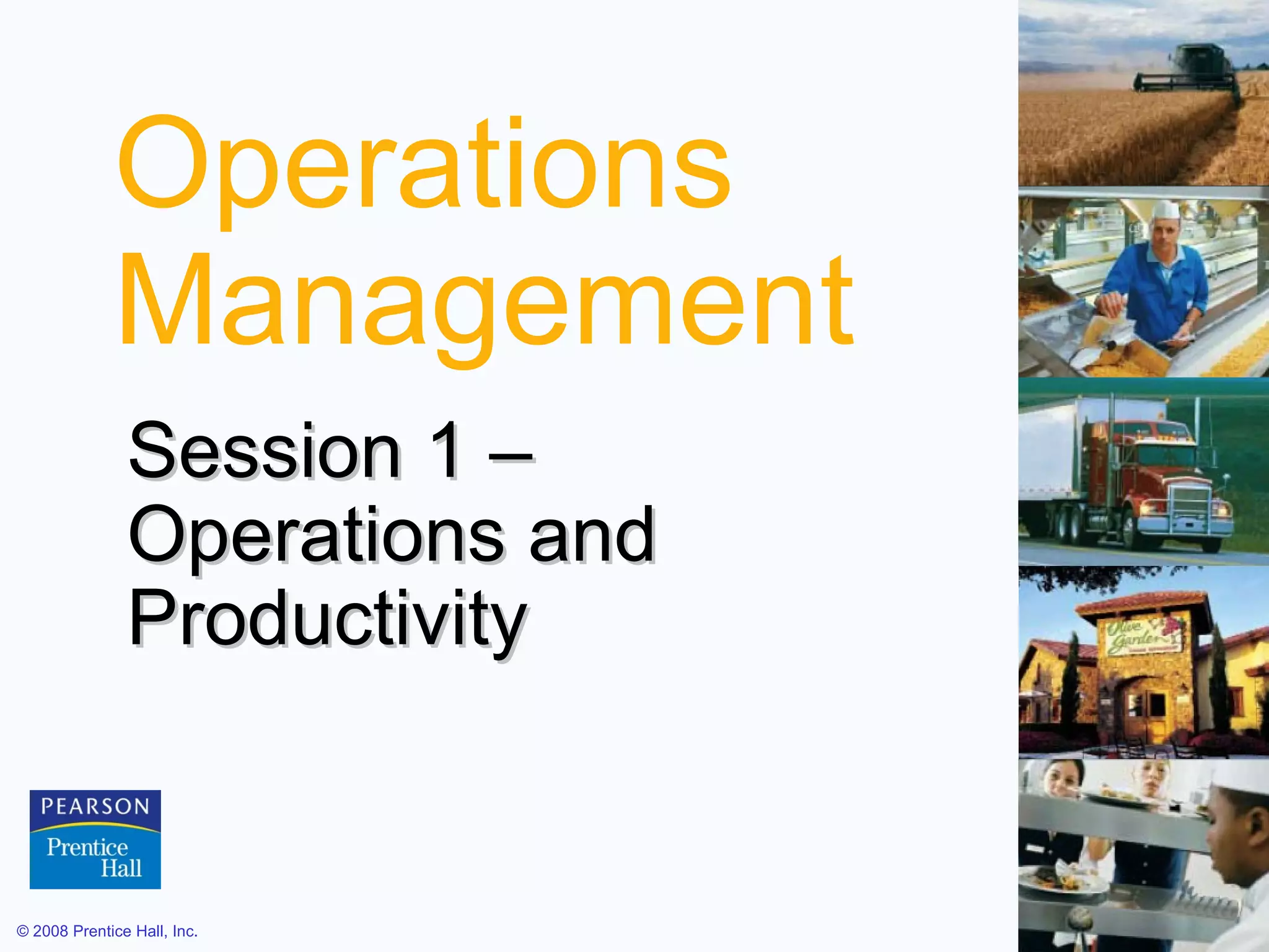 The document discusses key concepts in operations management including defining OM, distinguishing between goods and services, and explaining productivity and its measurement. It covers the critical decisions OM managers make, trends in the field, and strategies to improve productivity, noting that productivity increases are needed for economic growth. Labor, capital, and management each contribute to about 10%, 38%, and 52% of annual productivity gains respectively.