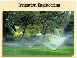 This document provides an overview of irrigation engineering. It defines irrigation as the artificial application of water to land to supplement natural precipitation for optimal crop production. Irrigation is needed in arid, semi-arid, and humid regions where rainfall is unreliable or insufficient. The objectives and scope of irrigation engineering are outlined, along with the factors, benefits, and potential ill-effects of irrigation. Standards for irrigation water quality and procedures for feasibility studies of irrigation projects are also discussed.