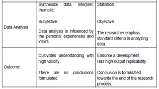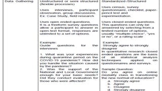 Practical Research 1 will provide a general understanding of how to conduct qualitative research and may encourage undertaking a study. It discusses defining research, the nature of inquiry and investigation, differentiating inquiry from research, the purpose and importance of research in daily life, characteristics of research, the seven steps of the research process, ethics in research including informed consent and respect for intellectual property, and rights of research participants including voluntary participation and anonymity.