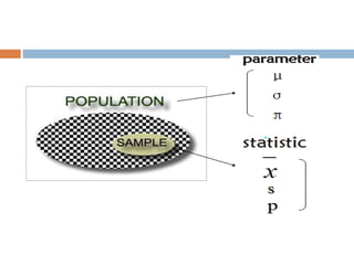 This document provides an introduction to biostatistics. It defines biostatistics as the application of statistical tools and concepts to data from biological sciences and medicine. The two main branches of statistics are described as descriptive statistics, which involves organizing and summarizing sample data, and inferential statistics, which involves generalizing from samples to populations. Several key statistical concepts are also defined, including populations, samples, variables, data types, levels of measurement, and common sampling methods. The objectives are to demonstrate knowledge of these fundamental statistical terms and concepts.