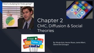 This document provides an overview of computer-mediated communication (CMC) and social media theories. It discusses how CMC allows for new forms of identity and interaction online. Early CMC occurred through bulletin board systems and email, while the World Wide Web expanded opportunities in the 1990s. Social networking sites now facilitate maintaining connections and engaging in online communities. New ideas and trends diffuse through social media, following models of technology adoption. Users are motivated by social and entertainment needs. Social media both extends existing power structures and empowers new voices. While enhancing connections, overreliance on online socializing can impact well-being. Memes and online culture shape understandings in new ways.