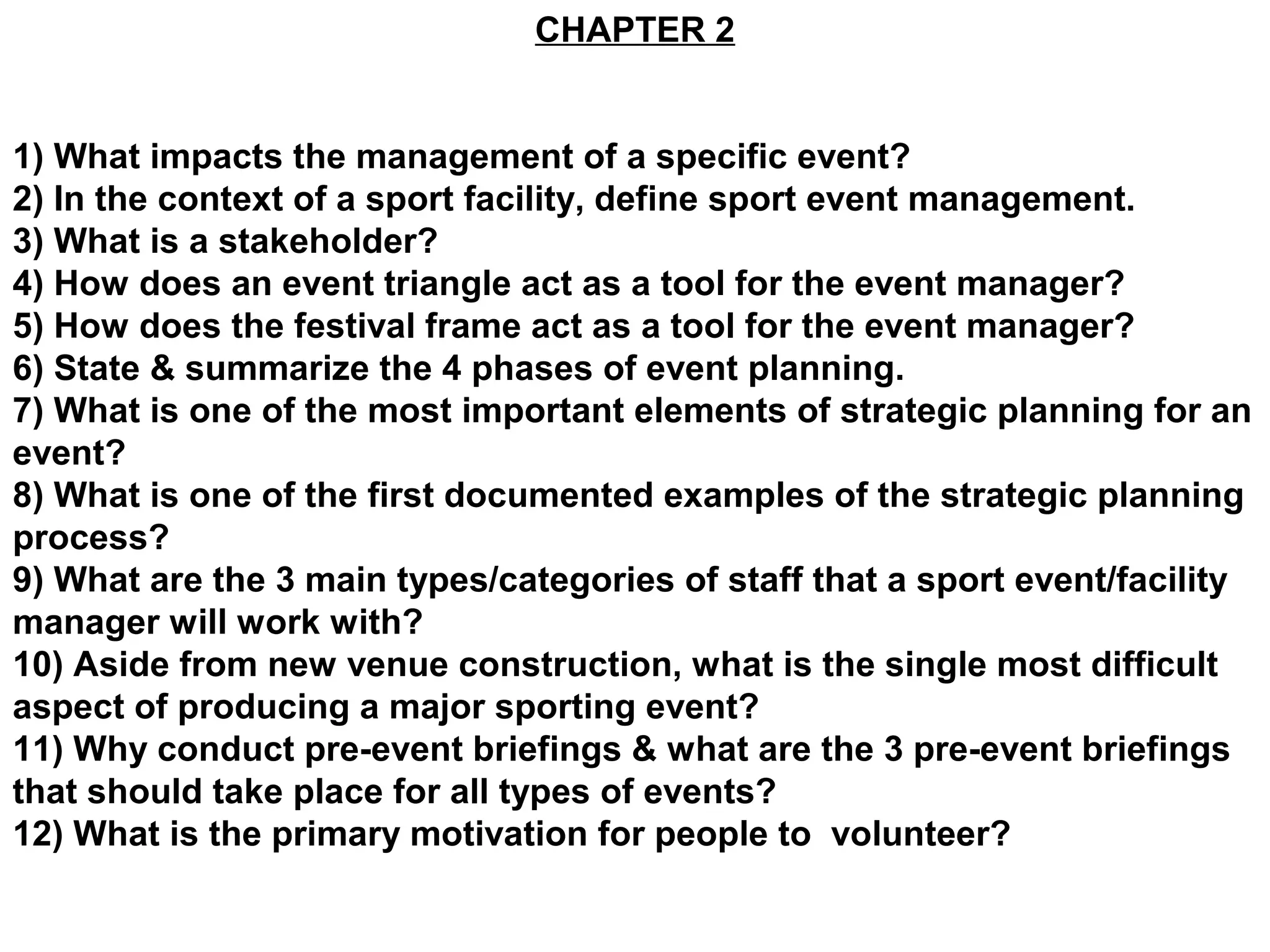 This document provides an overview of key concepts in event management. It defines sport event management and stakeholders. It discusses how tools like the event triangle and festival frame can help event managers. The 4 phases of event planning and importance of strategic planning are also covered. Finally, it addresses staffing, challenges of major events, and pre-event briefings.