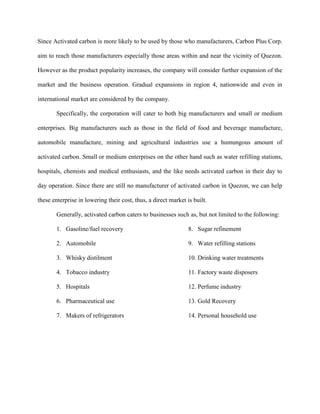 This document provides a marketing plan for Carbon Plus Corporation, which manufactures activated carbon. The plan includes defining the target market as businesses and organizations in Quezon Province that use activated carbon. It analyzes the size and districts of Quezon's market, and projects the demand for activated carbon from water refilling stations over the next 5 years. The plan also discusses determining market share and outlines Carbon Plus' marketing strategy using the 4 P's of product, price, place and promotion.