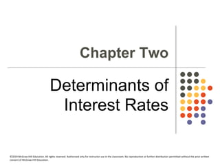 This document discusses various determinants of interest rates, including supply and demand factors that affect the rates for loanable funds and individual securities. It covers loanable funds theory and how household savings, business investment, government borrowing, and foreign capital flows impact the supply and demand for loanable funds. Additional topics include the nominal vs. real interest rates, term structure of interest rates, and time value of money principles for present and future values of lump sums and annuities.