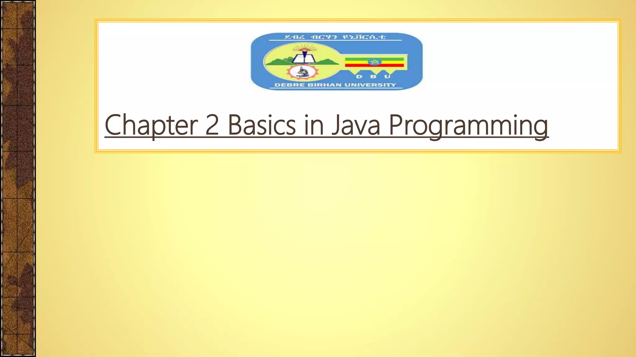 This document provides an overview of chapter 2 of a Java programming basics course. It outlines the key topics that will be covered, including the structure of Java programs, variables and data types, operators, selection statements like if/else and switch, iteration statements like while, do-while and for loops, and the break and continue keywords. Examples are provided for many of the concepts to demonstrate their usage in Java code.