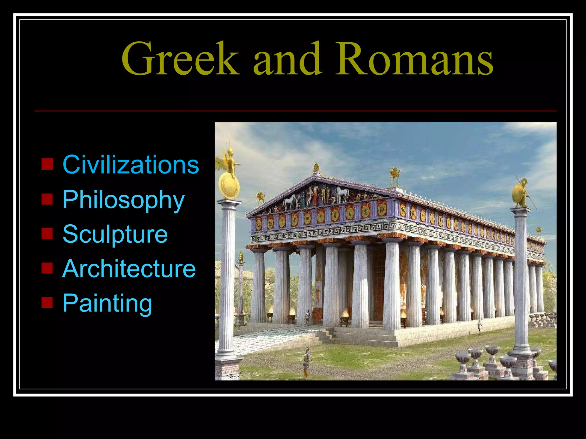 - The artistic and architectural accomplishments of ancient Greece, such as sculptures by Phidias and the Parthenon, had major influence on later Western traditions. The Roman Empire expanded on these influences while developing its own cultural and political dominance.