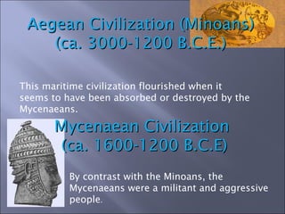 - The Mycenaeans were a powerful and militant people who absorbed the earlier Minoan civilization around 1600-1200 BCE.