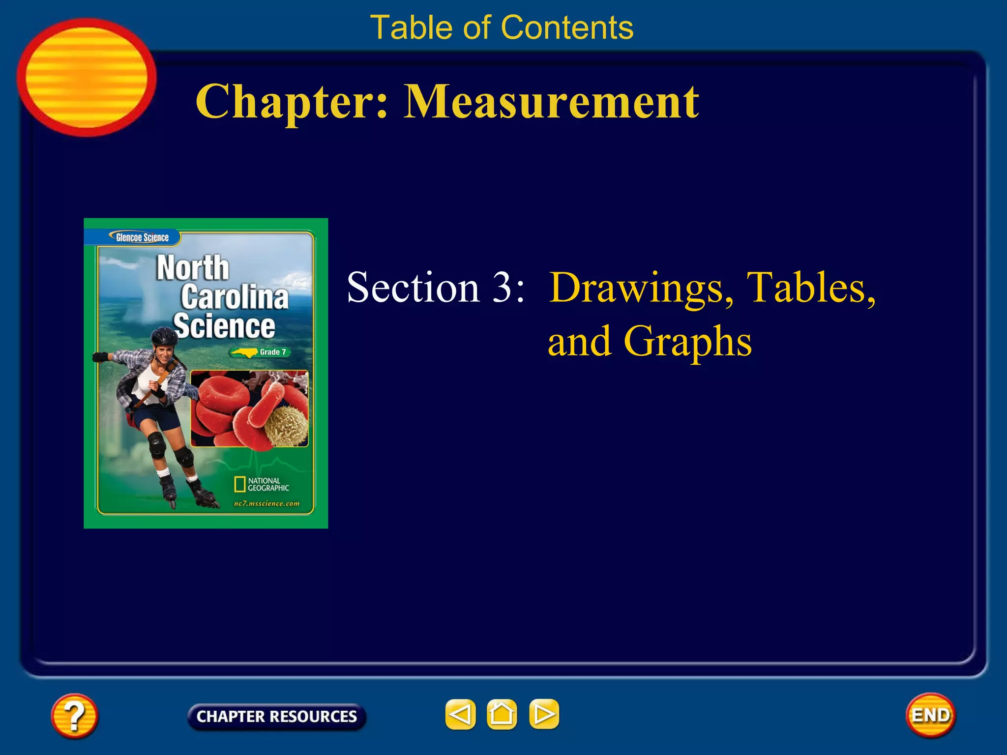 Scientific illustrations like drawings, photographs, tables, and graphs can clearly show relationships and details that may be difficult to explain through text alone. Drawings can depict object details and hidden features. Photographs capture objects at a single moment. Tables organize data in rows and columns. Common graphs are line graphs showing relationships between two variables, bar graphs comparing variables, and circle graphs displaying parts of a whole. Careful analysis of scales is important when interpreting graphs.