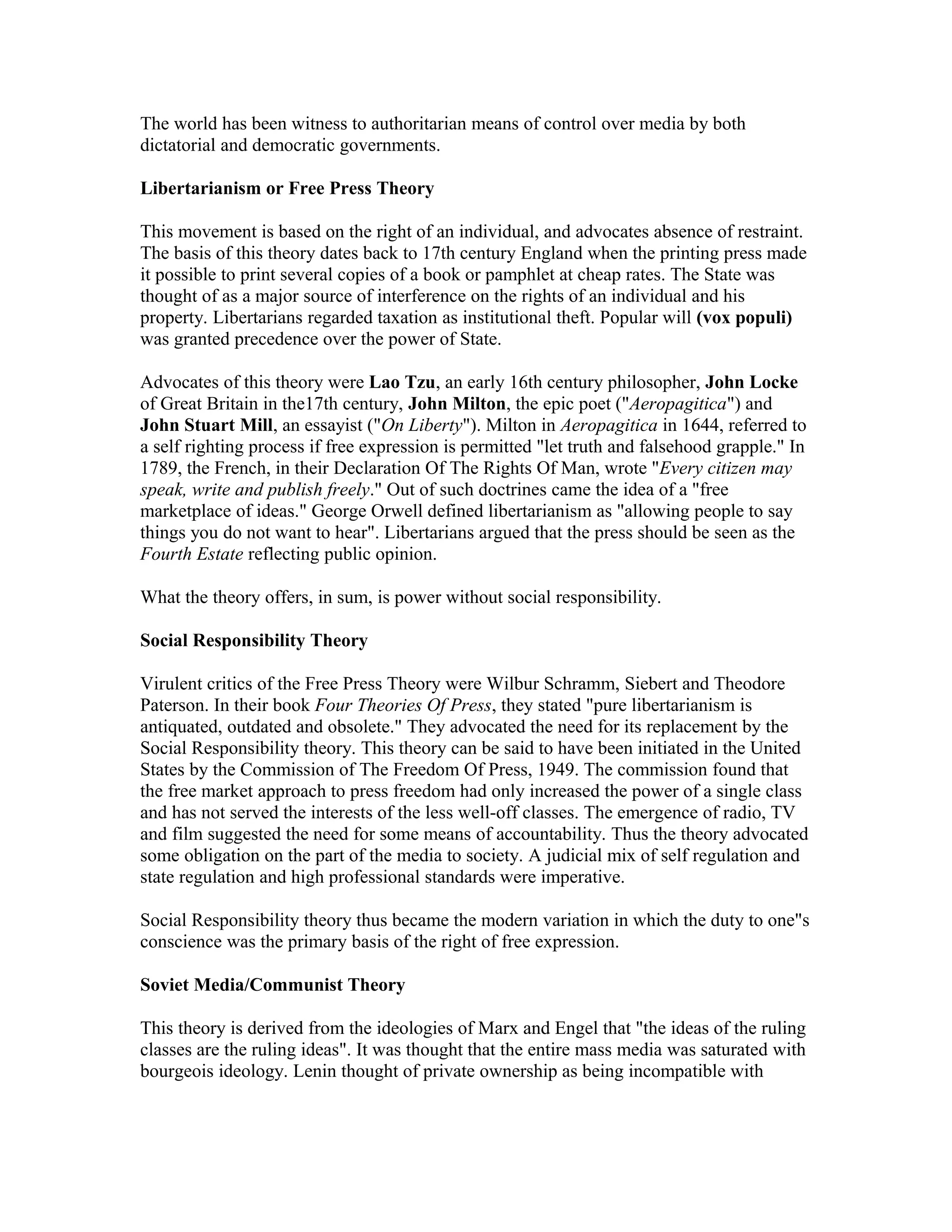 2) Classical theories include the authoritarian, libertarian, and social responsibility theories, which are based on political philosophies and view the role of media differently.