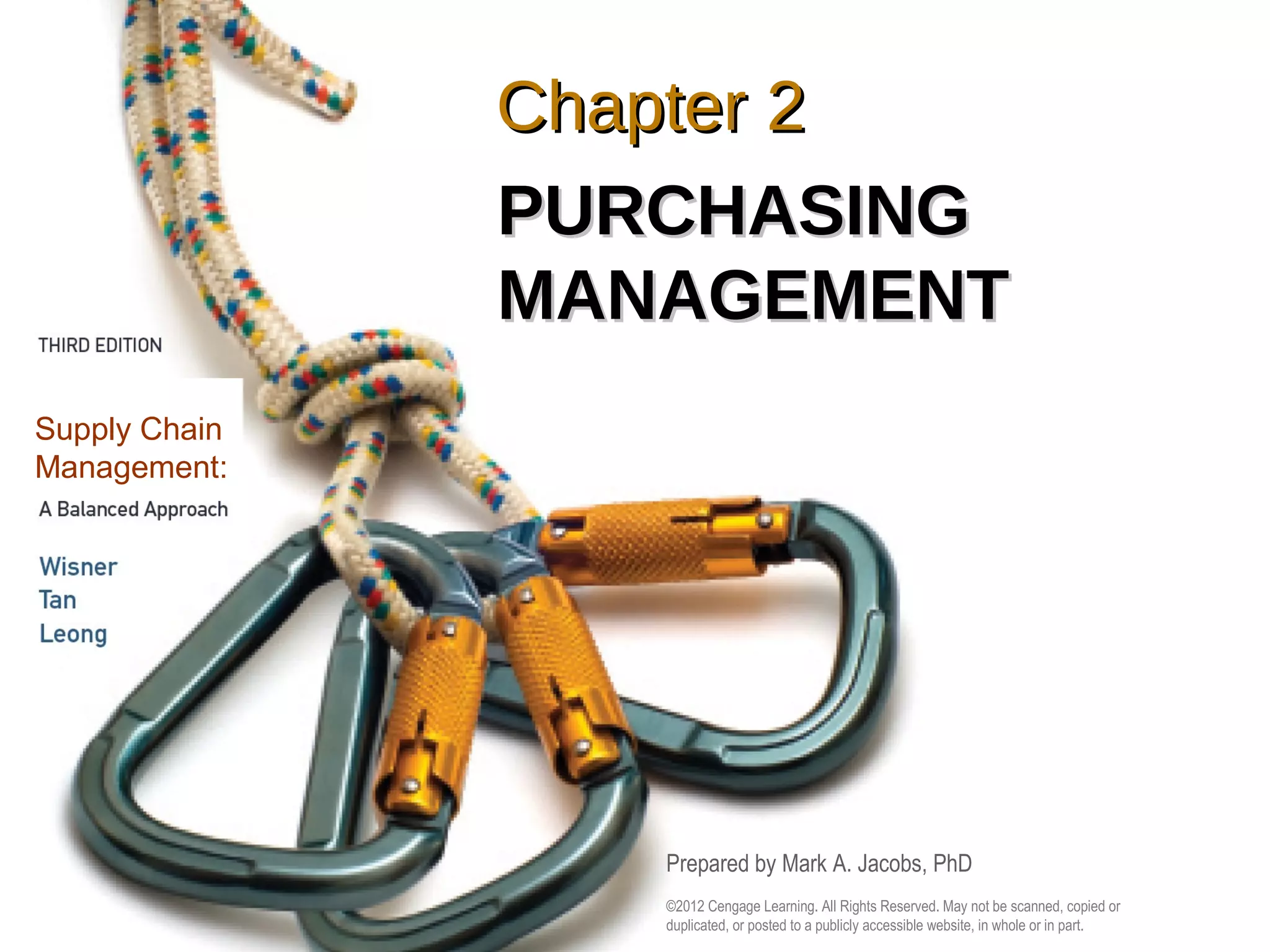 This document provides an overview of key concepts in supply chain management and purchasing. It outlines learning objectives related to understanding the strategic role of supply management, the purchasing process, sourcing decisions, supplier selection, and global sourcing. The purchasing process is described, including the traditional manual process involving requisitions, requests for quotes, purchase orders, delivery orders, and invoicing. The financial significance of supply management is also discussed in terms of profit leverage, return on assets, and inventory turnover. Figures are included to illustrate the traditional purchasing process.