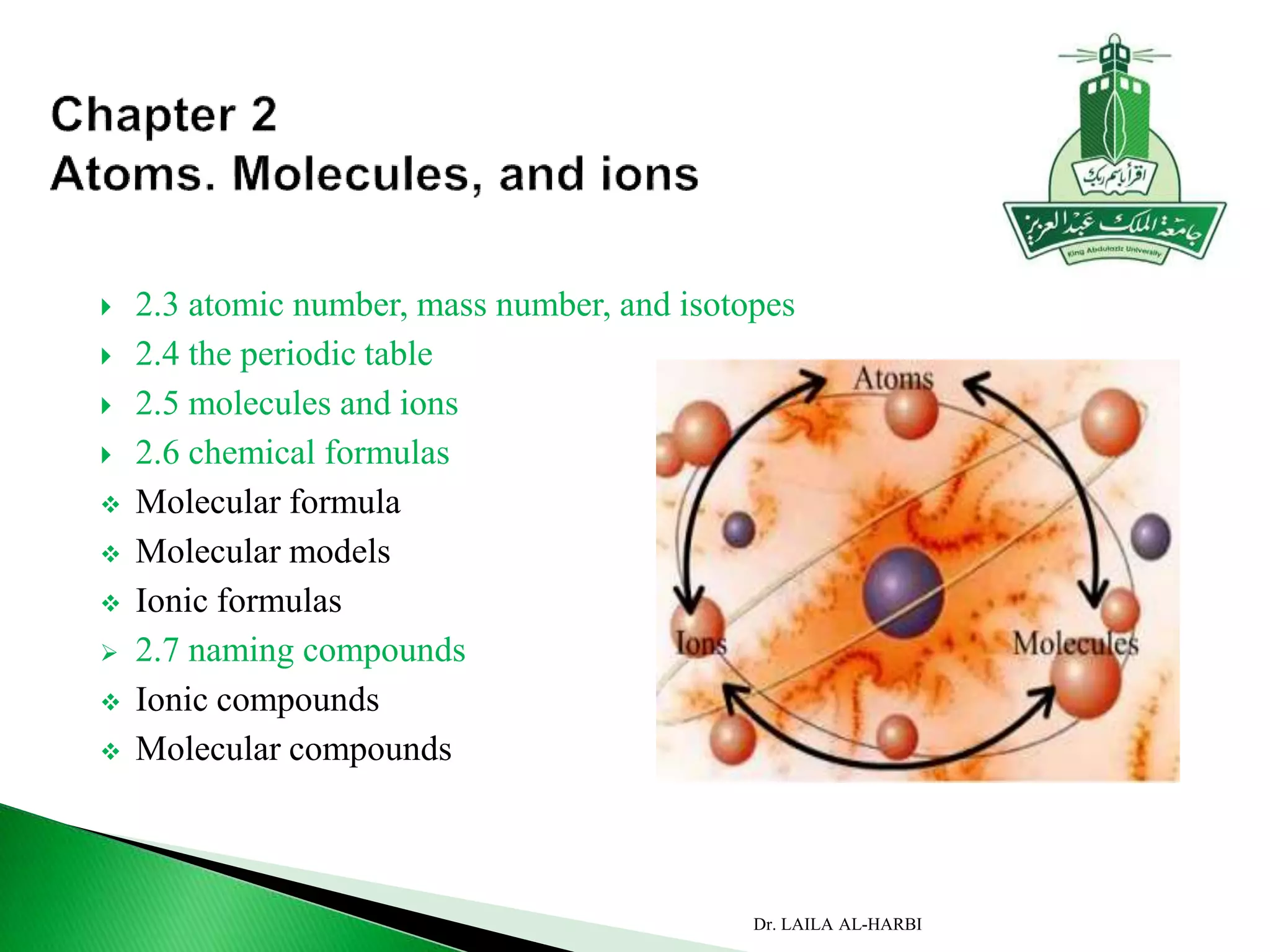 This document provides information about naming ionic and molecular compounds. It discusses atomic number, mass number, and isotopes. It explains that ions are formed when atoms gain or lose electrons to become positively or negatively charged. The document outlines rules for writing chemical formulas, including ionic formulas which involve balancing charges between cations and anions. It also discusses naming conventions for ionic compounds based on metal cations and nonmetal anions. The document concludes by stating that molecular compounds consist of nonmetals and do not involve ion formation.