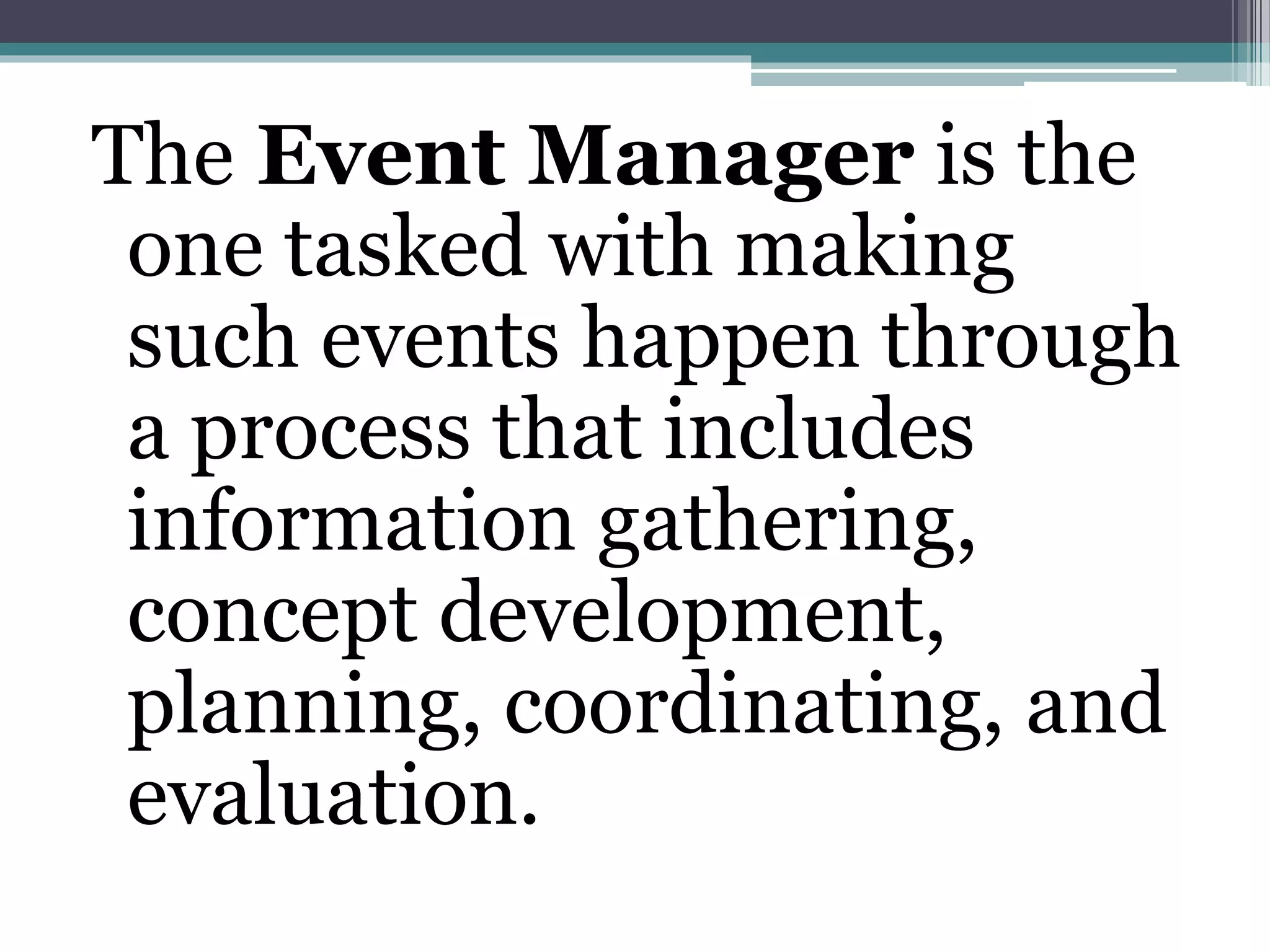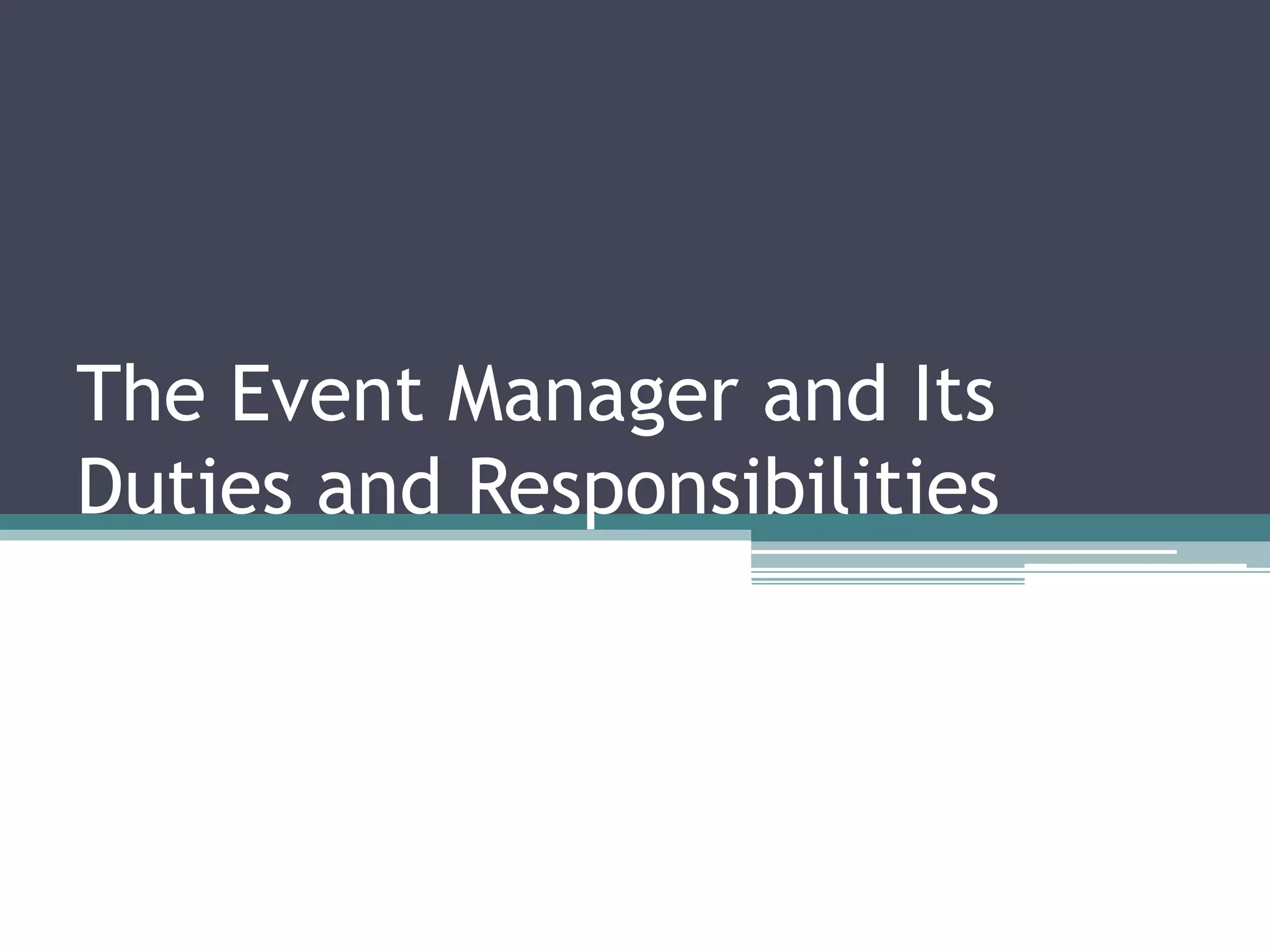 The Event Manager is responsible for planning, coordinating, and evaluating events through information gathering, concept development, planning, coordinating, and evaluation. They go by various titles like Event Coordinator, Meeting Planner, or Special Event Director. Key responsibilities include meeting with clients to determine event objectives and requirements, developing programs, budgets, and services, coordinating with committees and suppliers, and ensuring events conform to plans. Successful Event Managers require knowledge of event planning processes, customer service principles, and marketing/business management, as well as skills in communication, critical thinking, coordination, judgment, creativity, and problem analysis.