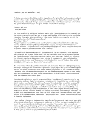 Danny prepares to leave his home on an island to begin his Pokemon journey. He battles a wild Marill with his Charmander. Danny's grandfather reminds him to care for his Pokemon. That evening, Danny boards a ferry captained by Aidan to travel to Pallet Town overnight. Danny tries to sleep in the ferry's small cabin as it cuts through the waves, thinking about making his father proud by becoming a great Pokemon trainer.