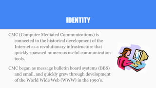 This document discusses the history and development of computer-mediated communication (CMC) and social media. It covers how CMC began with message boards and email and grew with the World Wide Web in the 1990s. Early online communities like Classmates.com and MySpace developed user profiles beyond just sharing email. Social networking became mainstream with sites like Facebook and Twitter. The document also discusses theories of diffusion of innovations, uses and gratification, and how social media both extends communication and makes solidarity more difficult due to impersonality. It poses discussion questions about how CMC has influenced relationships and the transfer of cultural understandings through internet memes.
