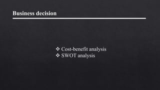 This document discusses two techniques for business decision making: cost-benefit analysis and SWOT analysis.