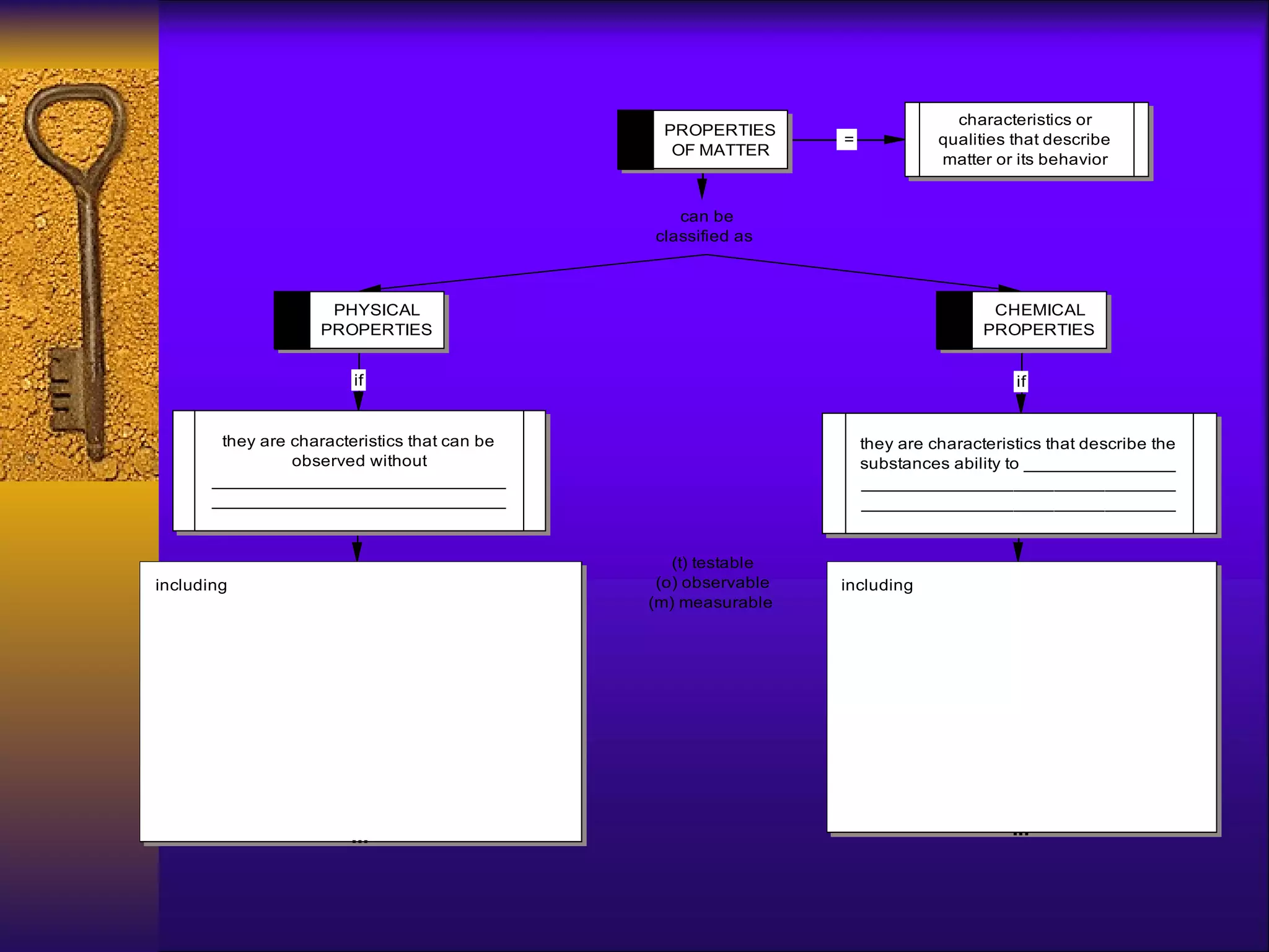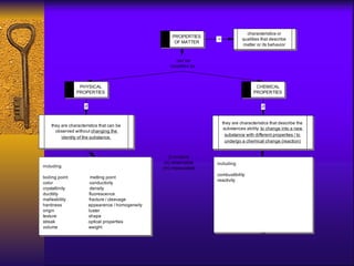 3. Chemical and physical properties and changes are defined, including examples like density, reactivity, physical changes like dissolving, and chemical changes like burning or rusting. Characteristics used to identify substances are outlined.