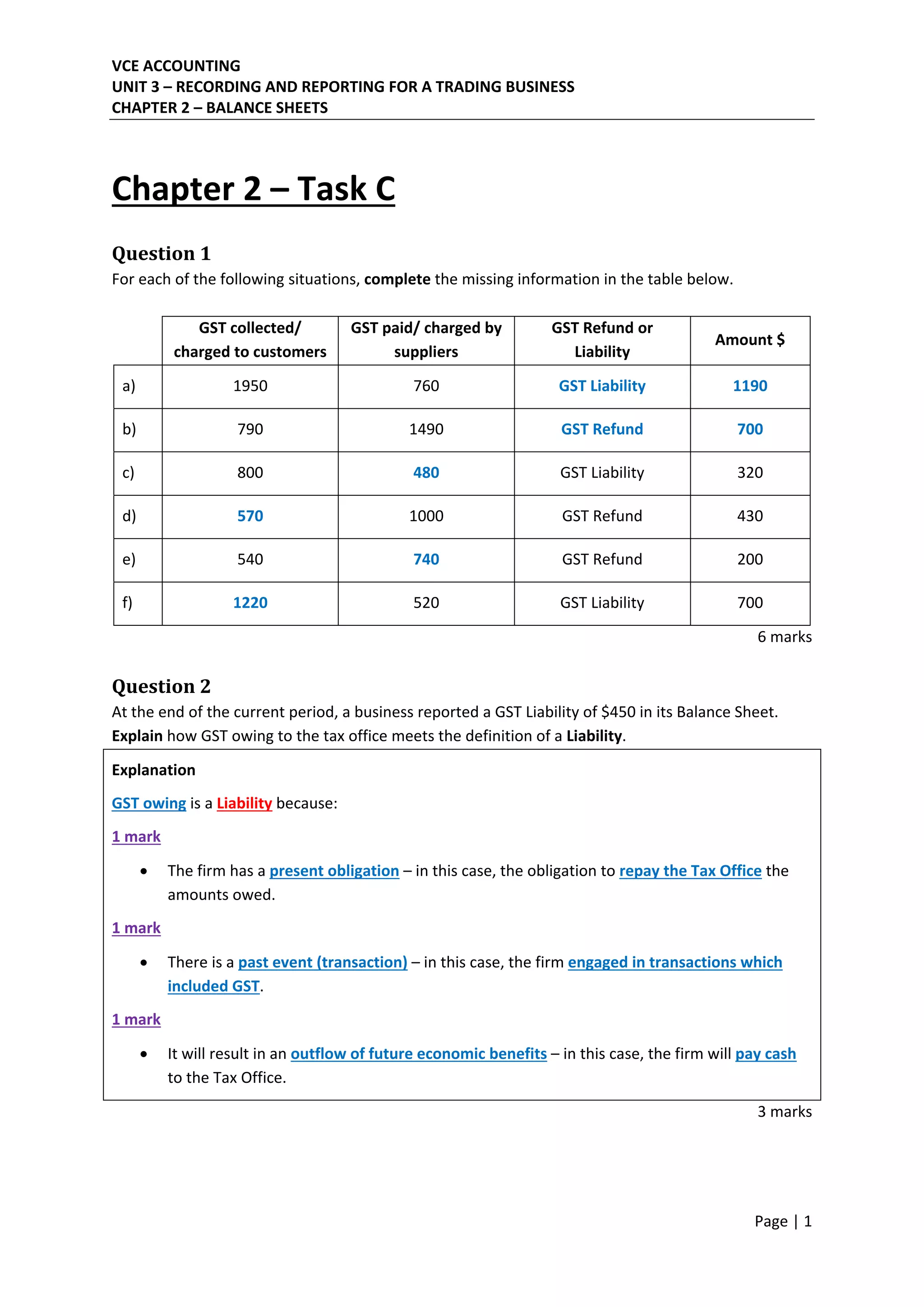 This document discusses balance sheets and GST (goods and services tax) reporting for a trading business. It includes sample questions and explanations. Question 1 provides examples of GST collected from customers, GST paid to suppliers, and the resulting GST refund or liability. Question 2 explains how a GST liability meets the definition of a liability on a balance sheet. Question 3 discusses why GST paid on purchases is not an expense. Question 4 addresses how GST would be classified on a balance sheet as either a current asset or liability.