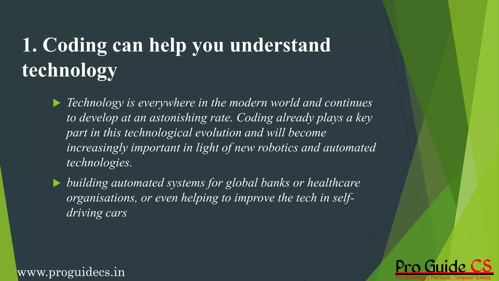 Coding provides several benefits. It can help one understand technology and how it is evolving. Learning to code also enhances problem solving skills by improving logical thinking. Coding allows people to showcase their creativity online by building complex websites and customizing them. Additionally, coding is a universal language that can be used across the world without translation, making it a valuable skill for international careers or jobs. Overall, coding improves career prospects with many in-demand and well-paying career options in fields like software development.