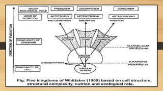 This document provides information on biological classification systems. It discusses taxonomy, systematics, and classification. It describes Turril's three types of taxonomy (alpha, beta, omega). It also summarizes classical and new systematics. The key classification systems discussed are the artificial, natural, and phylogenetic systems. It provides details on Linnaeus' artificial system and Bentham and Hooker's natural system. It concludes with descriptions of the two, three, four, five, and six kingdom classification systems.