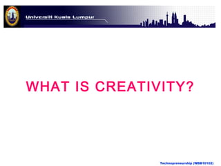 The document discusses the concepts of creativity, innovation, and identifying business opportunities. It begins by defining creativity as generating novel and high-quality ideas and innovation as converting opportunities into marketable products or services. It then outlines a 4-step process for identifying business opportunities: 1) identifying customer needs, 2) environmental scanning and self-analysis, 3) screening opportunities, 4) selecting an opportunity and creating a business plan. Later sections explore methods for generating creative ideas, different forms of innovation, and strategies for encouraging creativity and innovation in business.