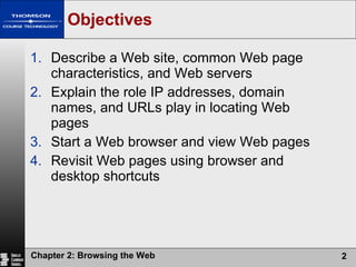 The document summarizes key concepts about browsing the web, including describing web sites and pages, explaining how IP addresses and URLs locate web content, and outlining how to navigate and customize a web browser. It also discusses risks of using the web like viruses and privacy concerns, emphasizing the importance of installing protection software and understanding sites' privacy policies.