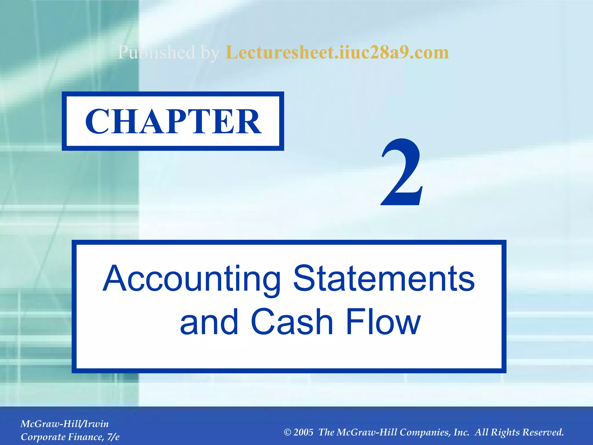 The document discusses accounting statements and cash flow. It provides an overview of key statements including the balance sheet, income statement, and statement of cash flows. The balance sheet presents a company's assets, liabilities, and equity on a given date. The income statement measures performance over a period of time by reporting revenues and expenses. The statement of cash flows reconciles cash flows from operating, investing, and financing activities. Sample statements are presented for a company called U.S. Composite Corporation to illustrate the components and analysis of each.