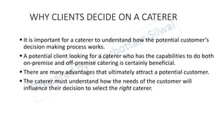 The document discusses factors that influence a client's selection of a caterer, including reputation, referrals, and word-of-mouth advertising. It also covers different types of catering environments like corporate and social catering. Researching each job and understanding client needs are important for caterers to plan successful events and develop long-term business relationships.