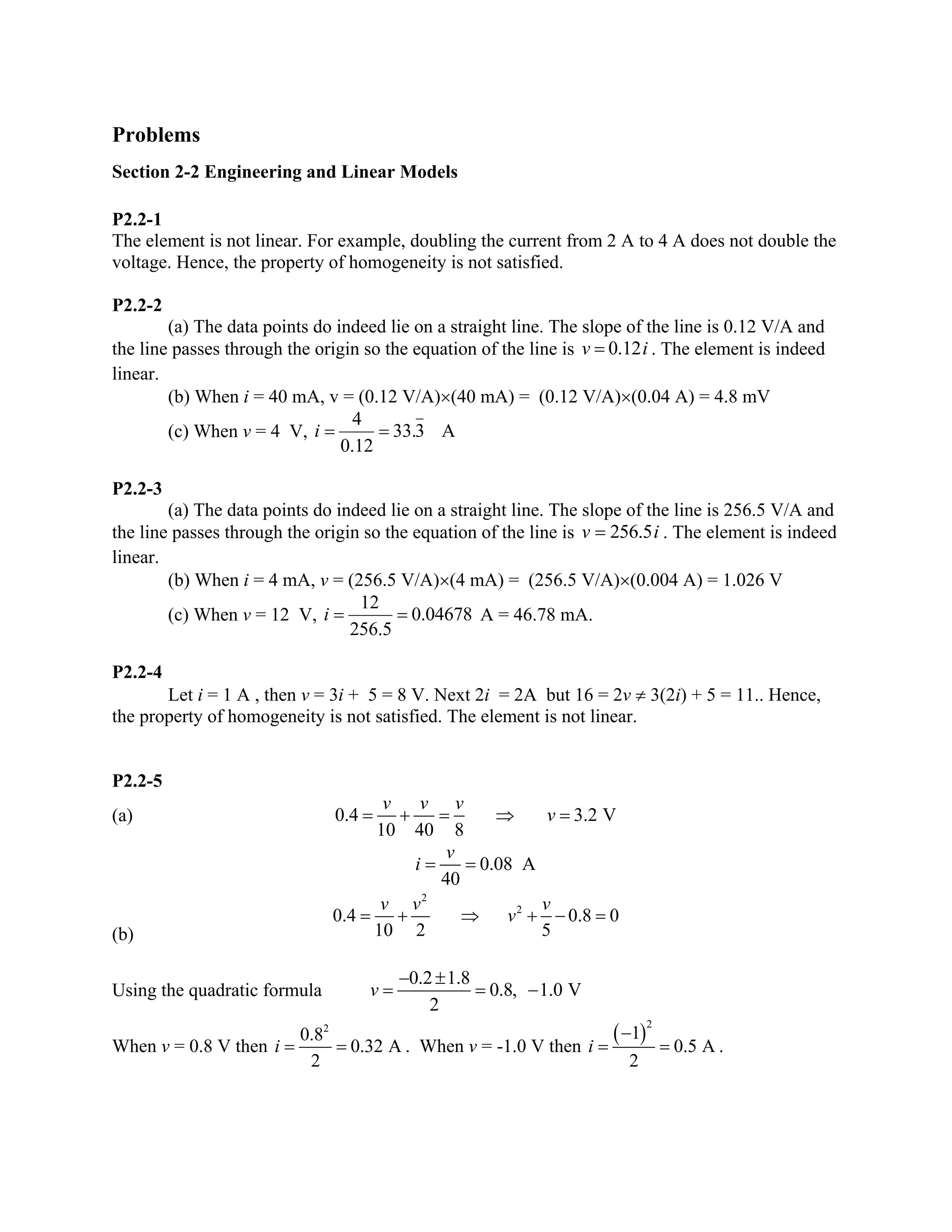 The document contains solutions to practice problems related to linear and nonlinear circuit elements, resistors, independent and dependent sources, transducers, switches, and measurement techniques. In problem P2.2-1, an element is found to be nonlinear because doubling the current does not double the voltage. In problem P2.4-1, the power absorbed by a resistor is calculated to be 21V×3A=63W. In problem P2.6-1, the power received by a voltage source is calculated to be 12V×0.5A=6W, with the source delivering -6W.