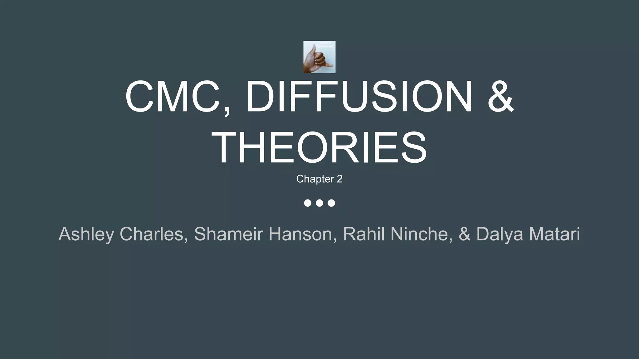This document discusses theories related to computer-mediated communication (CMC). It defines CMC as human communication via computers using text, images, audio, and video. Early social networking sites from the 1980s and 1990s are mentioned, as well as how CMC allows for identity fabrication but also truth. Theories discussed include diffusion of innovation theory, uses and gratifications theory, and concepts of online culture and power. Characteristics of social networking sites and their relationship to communication theory are also summarized.