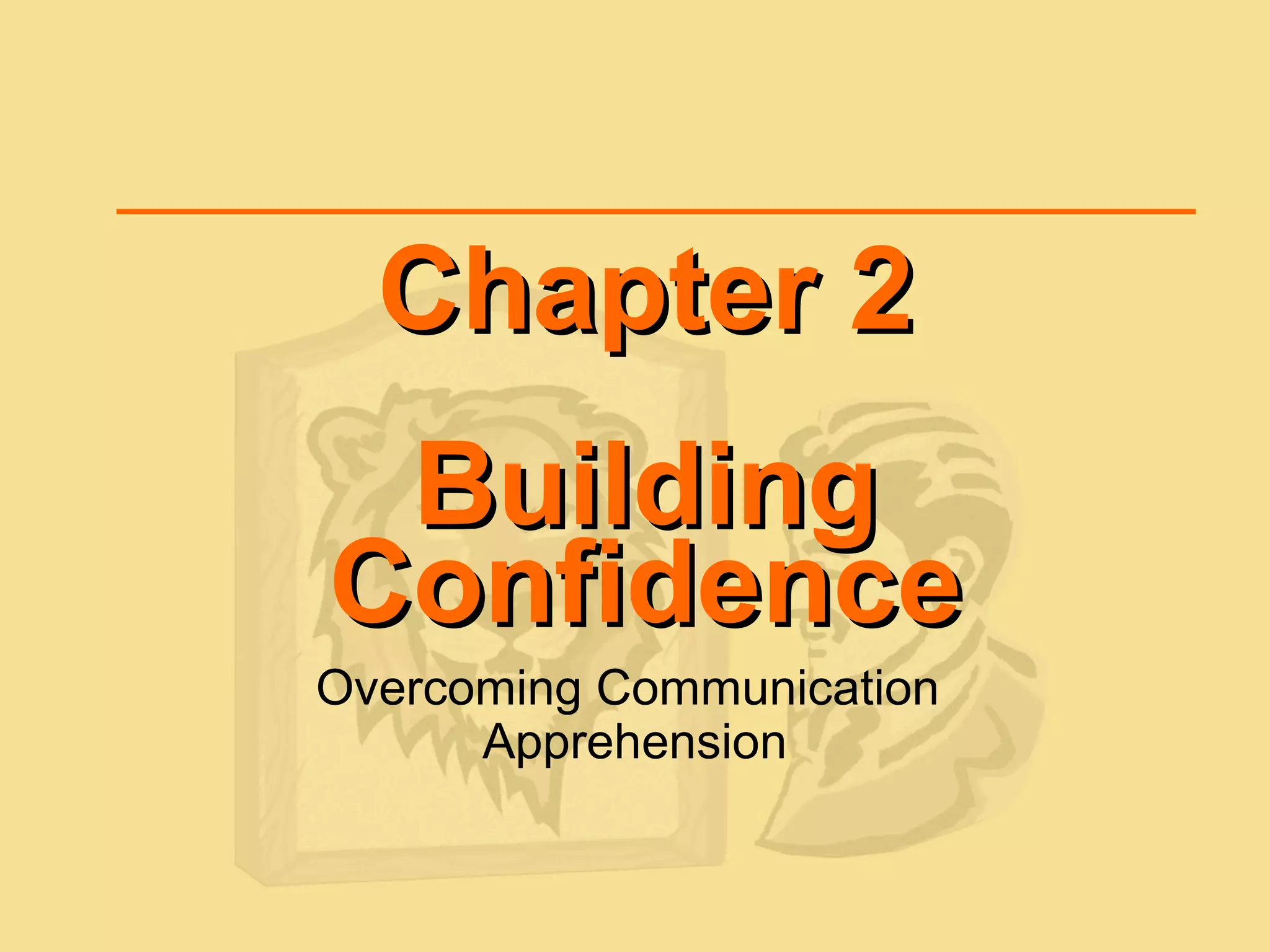 Communication apprehension, or stage fright, is a common fear that affects most people when speaking in public. It stems from a biological response where the body releases adrenaline to prepare for a potential threat. While meant to provide energy to flee or fight, in public speaking this surge of adrenaline can lead to physical symptoms like an upset stomach or flushed face. However, people in the audience often do not notice these signs of anxiety in speakers as much as the speakers fear. Re-framing one's perception of the audience and speech as a discussion rather than a performance can help build confidence. Practicing content, organization, and using notes are also recommended to establish confidence when speaking.