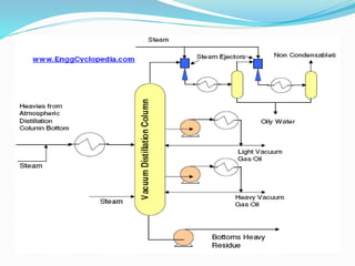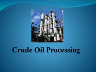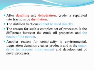 After crude oil is desalted and dehydrated, it is separated into fractions through distillation. However, the distilled fractions cannot be used directly and require further processing due to differences between crude oil properties and market needs. The complexity of refining processes is also due to environmental regulations that require cleaner products. Distillation involves heating crude oil to separate it based on boiling points, but the distilled fractions need additional conversion processes before they can be used or sold.